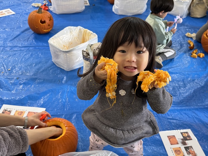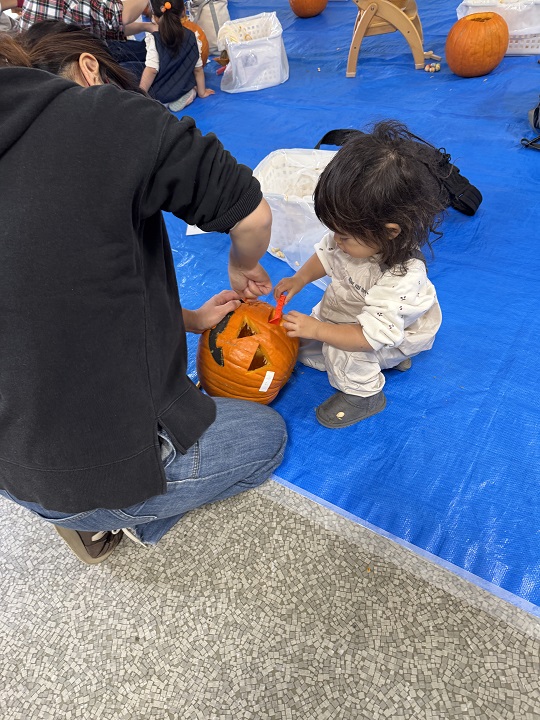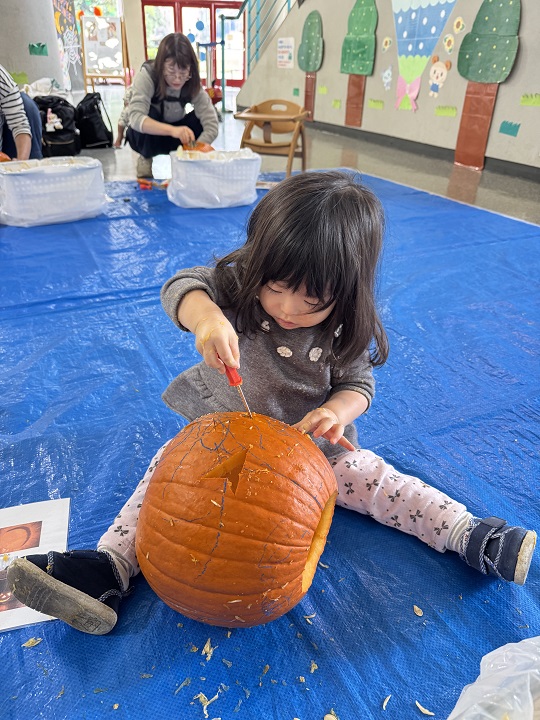 10/31は、学内にある子育て支援センター・ベアリスで、毎年恒例のかぼちゃのランタンづくりでした。