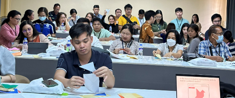 フィリピンでは年に一回やる気のある現職の先生方が集まり研究発表会が開催されます。そこで折り紙ワークショップを開いて、折り紙をつかった授業の紹介をしてきました。直角二等辺三角形を組み合わせて平行四辺形や台形などを作ったりしました。参加者は興味津々です。