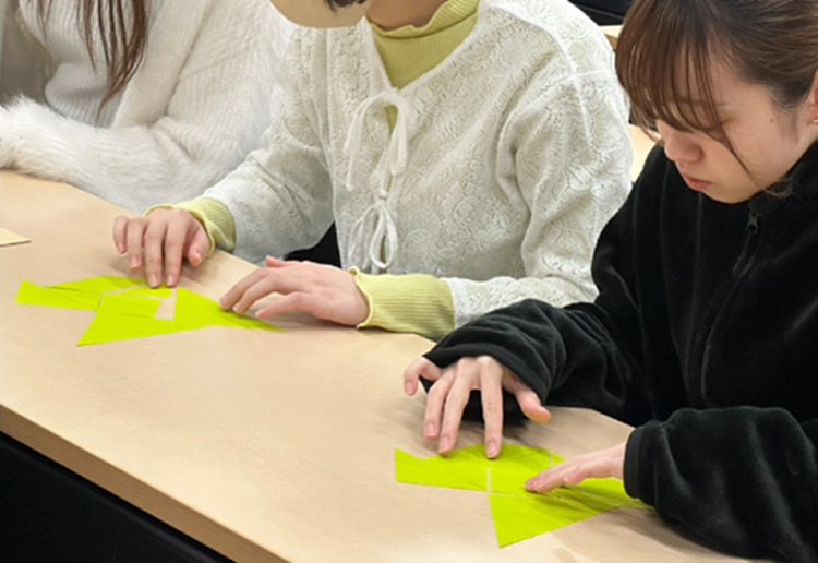 算数の授業では、教科の特性からか、教師はすぐに知識を教えたくなってしまうところがあります。そこで「算数」の講義では、数学的活動の一つとして図形パズルでハトの形を作る活動をしています(写真)。小学校の子どもたちはこのような数学的活動の中で図形感覚を養っているのですが、教師は何か教えたくなってしまい「ほら、直角三角形2つで正方形ができるね」なんて言ってしまうのです。