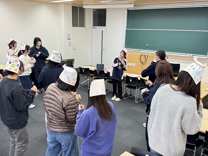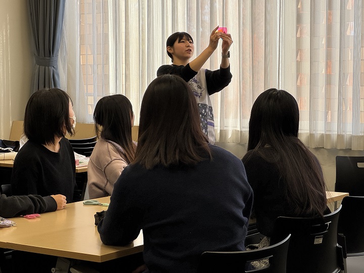 先生役の学生は、保育所実習本番を意識して、子ども向けのわかりやすい説明、ゆっくり通る声での語り掛けを意識したり、