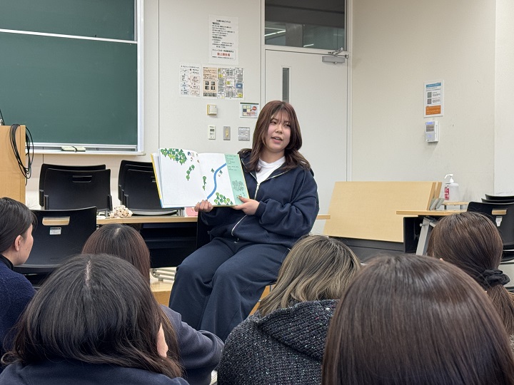 読み聞かせでは、子どもたち(役の学生)の表情を確認しながら読みます。