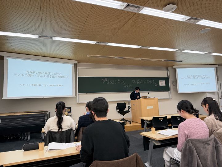 子ども教育福祉学科では、4年生になると集大成として卒業研究を行います。卒論発表会では学生同士あるいは教員、来賓の方々を迎えて卒業研究について発表する機会です。人前で自分の研究成果について発表することはちょっとドキドキしますが、社会人になればそのような機会がたくさんあるので、卒業してから「あのときやっておいてよかった~」と思うような行事です。
