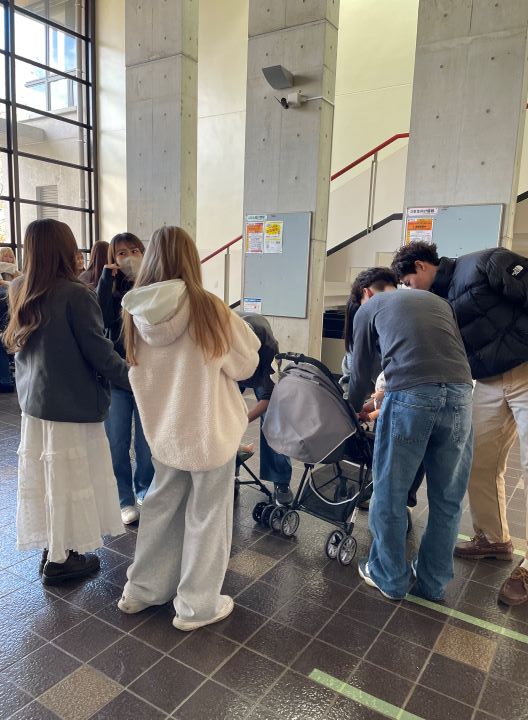 赤ちゃん人形を使いながら、ベビーカーの扱いについて学びました。